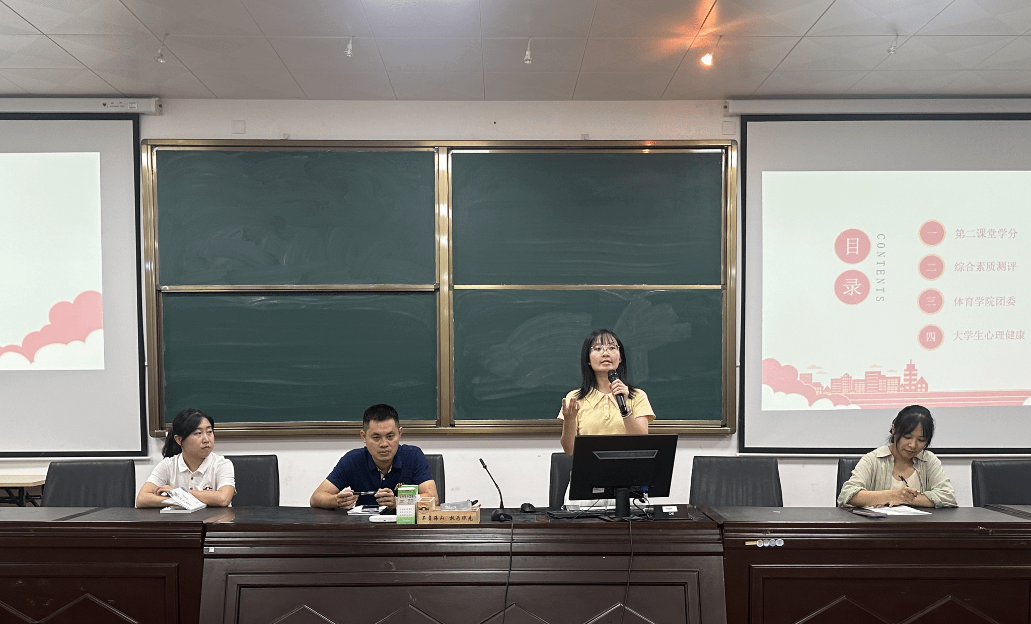 接着,羊芳芳老师为新生大学学习生活中的各类具体事项做出讲解并引导新生熟悉大学生活。对第二课堂学分每个模块进行详细讲解,强调了综测的重要性。同时,对太阳成集团团委学生会各个部门进行介绍,欢迎新同学加入学生会,成为一名学生干部,展示自己的风采。最后,羊导进行了大学生心理健康教育,将心理咨询的详情告诉大家,并对新生的心理测评工作进行部署。最后,羊老师希望同学们要尽快明确发展规划,练就过硬的专业本领,树立远大理想抱负,不负青春、不负韶华,努力成长为能够堪当民族复兴重任的文化体育人。